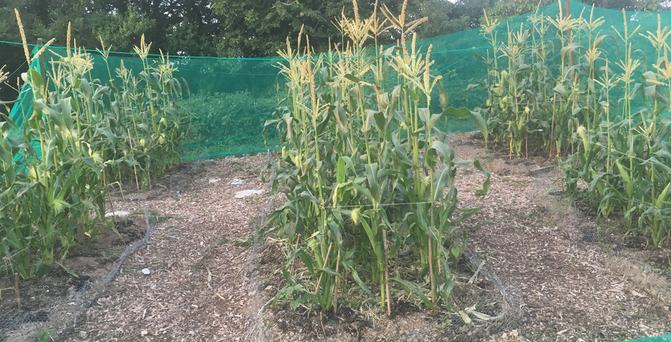 Last year I created 6 vegetable beds using a method of 'no-till method combined with a permaculture method of lasagna layering. Essentially a thick cardboard layer, followed by farm manure, then a layer of straw, some greens, leaves and seaweed. I then added a layer of quite dry sandy loam, typical of Cornwall. On the top I added 5% of shop bought concentrated farmyard manure. These beds were used for a trials project. I grew Sweetcorn very successfully here. They were inter-planted with dwarf french beans but these have been a target for slugs and none survived. 3 beds were my control (nothing added) and 3 were my treatment beds (added bio amendments)